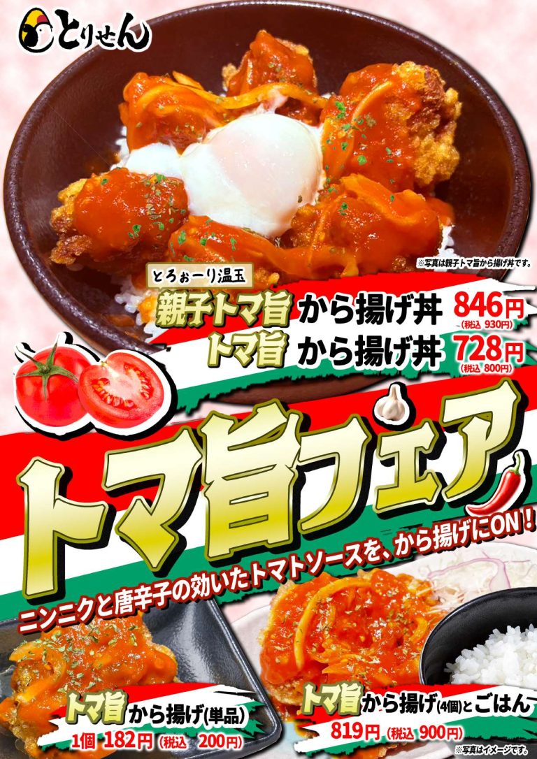 ・親子トマ旨から揚げ丼 ¥846(税込¥930) ・トマ旨から揚げ丼 ¥728(税込¥800) ・トマ旨から揚げ(4個)&ご飯 ¥819(税込¥900) ・トマ旨から揚げ単品(1個) ¥182(税込¥200)